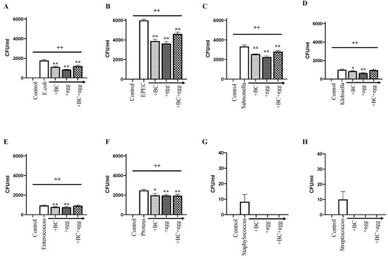 Effect of bovine colostrum (BC), egg, or the combination on transepithelial passage of bacteria. Bacterial strains (1 × 106 colony-forming units (CFU)/well) ± BC (1 mg/mL), egg (1 mg/mL), or the combination (0.6 mg/mL BC + 0.4 mg/mL egg) were added to the apical side of confluent monolayers of Caco-2 cells grown in transwell plates. The medium was collected from the basal side, 24 h later, and assessed for the number of colony-forming units (CFU)/mL. Control wells received no bacteria or test product. (A) Escherichia coli ATCC 25922 O6; (B) enteropathogenic E. coli (EPEC); (C) Salmonella; (D) Klebsiella; (E) Enterococcus; (F) Proteus; (G) Staphylococcus; (H) Streptococcus. Note that the scale of the y-axis of results for Staphylococcus and Streptococcus are lower than for other strains. Results are expressed as mean ± SEM for 6 wells. ++ signifies p < 0.01 vs. non treated (without bacteria or test product) control, * and ** signify p < 0.05 and 0.01 vs. bacteria alone. The nonpathogenic and noninvasive E. coli K12 did not result in any CFUs in this experiment, and therefore is not shown.