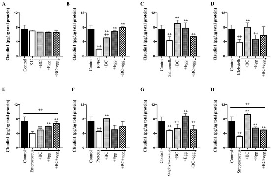 Effect of BC, egg, or the combination on tight junction protein, claudin-1. Bacterial strains (1 × 106 CFU/well) ± BC (1 mg/mL), egg (1 mg/mL), or the combination (0.6 mg/mL BC + 0.4 mg/mL egg) were added to confluent monolayers of Caco-2 cells. Cleared lysates were prepared 24 h later. Control wells received no bacteria or test product. (A) Escherichia coli K12 (negative control); (B) EPEC; (C) Salmonella; (D) Klebsiella; (E) Enterococcus; (F) Proteus; (G) Staphylococcus; (H) Streptococcus. Results are expressed as mean ± SEM from 3 wells. ++ signifies p < 0.01 vs. non treated (without bacteria or test product) control and ** signifies p < 0.01 vs. bacteria alone.