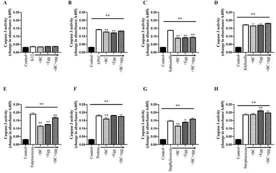 Effect of BC, egg, or the combination on active caspase-3. Bacterial strains (1 × 106 CFU/well) ± BC (1 mg/mL), egg (1 mg/mL), or the combination (0.6 mg/mL BC + 0.4 mg/mL egg) were added to confluent monolayers of Caco-2 cells. Cleared lysates were prepared 24 h later. Control wells received no bacteria or test product. (A) E. coli K12 (negative control); (B) EPEC; (C) Salmonella; (D) Klebsiella; (E) Enterococcus; (F) Proteus; (G) Staphylococcus; (H) Streptococcus. Results are expressed as mean ± SEM from 3 wells. ++ signifies p < 0.01 vs. non treated (without bacteria or test product) control and * & ** signify p < 0.05 & 0.01 vs. bacteria alone.