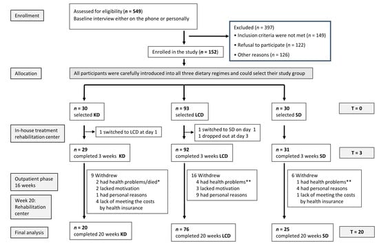 After 16 weeks of an outpatient phase, patients underwent another week of a “rehabilitation refresher” while maintaining their diet until the final examination. Unfortunately, in five cases, health insurances refused to cover the costs of this week, and therefore four KD patients and one SD patient could not participate in the final examination. Here, telephone interviews revealed that all five persons adhered to their diet until T20. Additional reasons for dropouts included lack of motivation, personal (not medical/health) reasons, and health problems (Figure 1). At T20, there were 20 patients in KD, 76 in LCD, and 25 in SD.