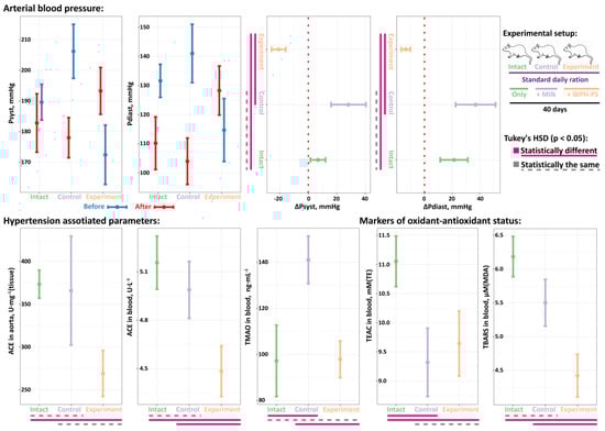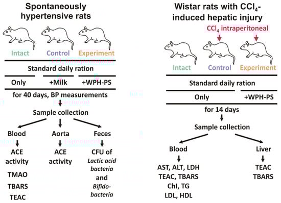 The experimental setup included three groups of ten SHRs: intact, control and experimental. While the intact animals received only a standard daily ration, the ration of the experimental group was supplemented with the WPH–PS composition. The SHRs which daily ration was supplemented with milk were used as a comparative control.