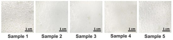 For all WPH–PS compositions, the quality of foams was evaluated in terms of bubble size, and bubble homogeneity (Figure 2). Bubble size increased in the series (sample 2 < sample 3 < sample 4 < sample 1 ≤ sample 5), and the size of the bubbles was negatively correlated with the bubble homogeneity. Generally, the samples with the higher pectin content were characterized by bigger bubble size. The smallest and the most homogeneous bubbles were observed in sample 2 (Figure 2).