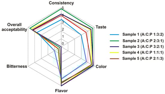 All products were stored for 1 day at 5 °C before the sensory evaluation. The sensory evaluation was carried out using eight panelists familiar with the product. The samples were evaluated for consistency, flavor, taste, bitterness, color and overall acceptability, on a five-point hedonic scale.