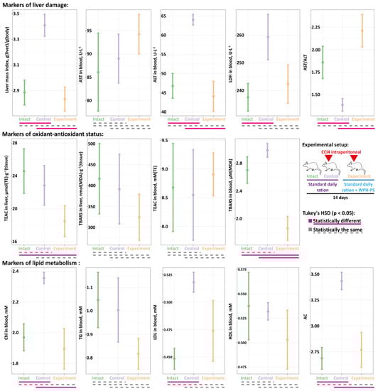 Based on the determined in vitro and in vivo antioxidant activity of the WPH–PS composition it was proposed that its administration can alleviate effects of an oxidative stress to an organism. It is well known that a toxic dose of CCl4 increases the concentration of reactive oxygen species (ROS) in the liver causing acute liver damage [,,]. Hence, the in vivo antioxidant property of WPH–PS composition was assessed using a rat model with CCl4-induced hepatic injury (Figure 5). The hepatotoxicity was induced by the administration of a single intraperitoneal dose of CCl4. Thereafter, a standard daily ration of an experimental group of rats was supplemented with WPH–PS composition, while the ration of a control group was unaltered. Additionally, a group of rats without CCl4-induced hepatic injury on the standard ration was used as an intact control.