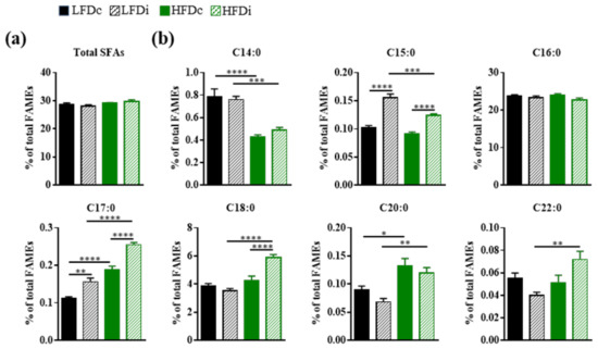 In addition to the effect of fat, the type of fiber incorporated in the diet modulated the hepatic content in SFAs. Indeed, hepatic amounts of C15:0 and C17:0 were significantly increased in the livers of mice fed inulin-supplemented LFD (C15:0, p < 0.0001 and C17:0, p < 0.05) and HFD (p < 0.0001) compared to those fed with cellulose-supplemented diets (Figure 3b). Similarly, the level of C18:0 was significantly (p < 0.0001) increased in the livers of HFDi-fed mice compared to those of HFDc-fed mice (Figure 3b). No effect of inulin was observed on the hepatic amounts of C14:0, C20:0, and C22:0.