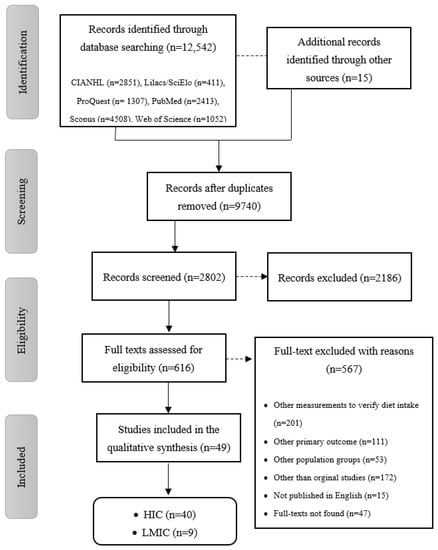 Studies included in this review are summarized in Figure 1. A total of 12,557 eligible papers were identified: 2851 from CIANHL/EBSCO, 411 from Lilacs/SciElo, 1307 from ProQuest, 2413 from PubMed, 4508 from Scopus, and 1052 from Web of Science. After excluding duplicates and reading titles, 2802 studies were assessed for eligibility. Finally, 616 full-text articles met the inclusion criteria and 49 were considered for the qualitative synthesis.