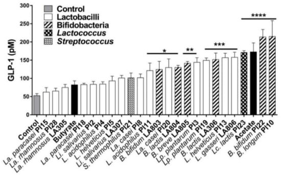 Effect of selected strains on GLP-1 secretion by STC-1 cells. Cells were stimulated for 8 h with probiotics. GLP-1 secretion was measured by Radioimmunoassay (RIA). * refers to the comparison between bacteria-exposed STC-1 cells and untreated cells (medium control), * p < 0.05, ** p < 0.01, *** p < 0.001, **** p < 0.0001.