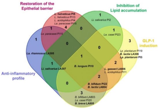 We have previously screened the same probiotic strains for their anti-inflammatory activity and their ability to restore the intestinal epithelial barrier [20]. Figure 3 combines the results obtained with all these in vitro models with the present ones (i.e., ability to limit lipid accumulation in adipocytes and to enhance GLP-1 production by endocrine cells). Based on these screenings, we selected the following nine strains: one strain with only the most anti-inflammatory property (La. rhamnosus LA305), one strain with high ability to strengthen the gut barrier (L. helveticus PI5), and one strain enhancing GLP-1 only (L. helveticus PI13). In addition, strains combining two properties (B. breve LA805, Li. salivarius LA307, L. gasseri LA806), three properties (B. animalis subsp. lactis LA804, B. bifidum PI22), or all properties (B. longum PI10) were also selected for further in vivo testing.