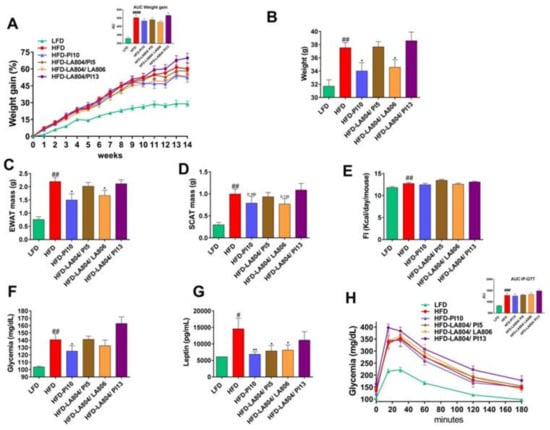 Expectedly, fasting blood glucose and leptin levels were significantly higher in HFD-fed mice than in LFD-fed mice (respectively, p < 0.01 and p < 0.05) (Figure 4F,G). Consistent with their impact on body weight and fat mass, treatment with B. longum PI10 alone or with the combination of B. animalis subsp. lactis LA804 and L. gasseri LA806 significantly limited the HFD-induced increase in blood glucose and leptin levels. Despite no significant impact on body weight or fat mass (Figure 4A–D), the administration of the mixture of B. animalis subsp. lactis LA804 and L. helveticus PI5 also significantly decreased blood leptin levels (p < 0.05). Blood insulin and adiponectin levels were not significantly different between the different groups (data not shown). To evaluate the impact of the probiotics on the development of insulin resistance, an intra-peritoneal glucose tolerance test (IP-GTT) was performed after 12 weeks of diet (Figure 4H). Compared to LFD-fed animals, HFD-fed mice were strongly glucose intolerant (p < 0.001). However, none of the probiotic strains or mixtures had an effect on the in vivo tolerance to glucose.