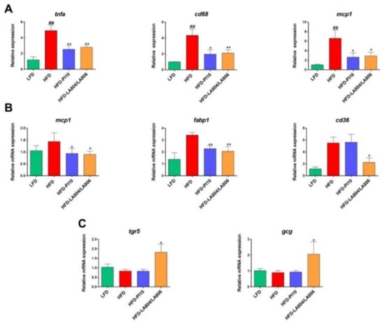 B. longum PI10 and the mixture of B. animalis subsp. lactis LA804 and L. gasseri LA806 limited the HFD-induced gene expression of inflammatory markers in the visceral adipose tissue and modulated the HFD-induced expression of genes involved in inflammation, fatty acid metabolism, and bile acid signaling in the small intestine. (A) The expression levels of inflammatory-related (tnfa, cd68 and mcp1) were quantified in the visceral adipose tissue at sacrifice by RT-qPCR. (B) Quantification of the expression levels of genes involved in inflammation (mcp-1) and fatty acid uptake and transport (fabp1, cd36) in the jejunum. (C) The expression levels of genes encoding the receptor for bile acids (tgr5) and proglucagon (gcg) in the duodenum. Values are expressed as the relative mRNA levels compared with LFD mice and expressed as mean ± standard error of the mean (S.E.M) of 6 (LFD group) to 8 (HFD groups) mice per group. #corresponds to regime effect (HFD vs. LFD), * corresponds to treatment effect (Probiotic vs. Excipient), * p < 0.05, ** or ## p < 0.01.