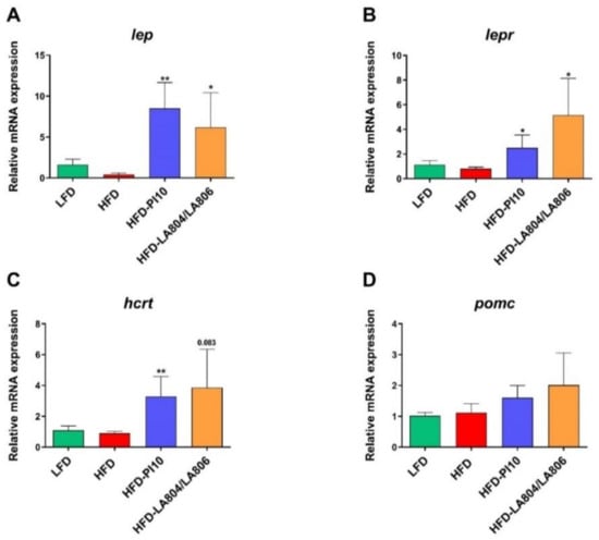 B. longum PI10 and the mixture of B. animalis subsp. lactis LA804 and L. gasseri LA806 modulated hypothalamic expression of genes involved in food intake and energy expenditure. The expression levels of genes encoding (A), leptin (lep), (B) leptin receptor (lepr) (C) orexin (hcrt), and (D) proopiomelanocortin (Pomc) were quantified in the hypothalamus of LFD-fed mice and HFD-fed mice treated or not with the selected probiotic strains by RT-qPCR. Values are expressed as the relative mRNA levels compared with LFD mice and expressed as mean ± SEM of 6 (LFD group) to 8 (HFD groups) mice per group. *corresponds to treatment effect (Probiotic vs. Excipient), * p < 0.05, ** p < 0.01.
