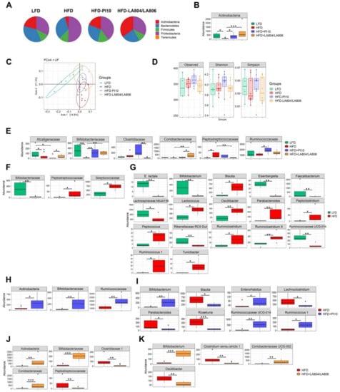 B. longum PI10 strain and B. animalis subsp. lactis LA804 and L. gasseri LA806 mixture had an impact on the HFD-induced microbiota dysbiosis. (A) Relative abundance of the dominant phyla evaluated by 16S rRNA MiSeq sequencing in cecal contents. (B) Relative abundance of Actinobacteria for each group of mice. (C) PCoA (Unifrac) analysis showing comparative differences between groups at the phylum, family, and genus levels. (D) Diversity indexes (observed, Shannon, Simpson). (E) Differences in the relative abundance of families between groups. (F) Differences in the relative abundance of families and (G) genera between LFD and HFD groups. (H) Differences in the relative abundance of families and (I) genera between HFD and HFD-PI10 groups. (J) Differences in the relative abundance of families and (K) genera between HFD and HFD-LA804 + LA806 groups. * p < 0.05, ** p < 0.01; *** p < 0.001.