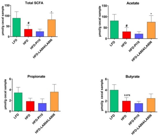 Since changes in the composition of the gut microbiota may alter its metabolic activity, we next measured in cecal contents the levels of total SCFAs and of the main ones (acetate, propionate, and butyrate) known to exert multiple beneficial effects on mammalian energy metabolism. As expected, total SCFAs and acetate levels were significantly lower in HFD-fed mice than in LFD-fed animals, whereas the reduced levels of propionate and butyrate were not significant (Figure 8). The mixture of B. animalis subsp. lactis LA804 and L. gasseri LA806 significantly restored the levels of total SCFAs and acetate, and, to a lesser extent, the levels of propionate and butyrate. In contrast, B. longum PI10 had no impact on SCFAs’ levels.