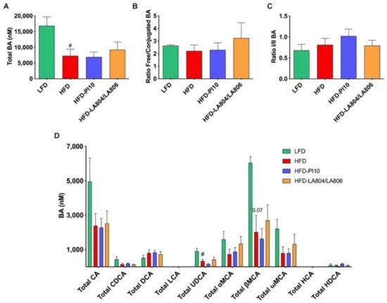 B. longum PI10 strain and B. animalis subsp. lactis LA804 and L. gasseri LA806 mixture have no effect on portal BA concentrations. (A) Total BA concentrations; (B) Ratio Free/Conjugated BA; (C) Ratio primary/secondary BA; (D) Different BA species concentrations. Results are expressed as mean ± SEM. # p < 0.05 HFD vs. LFD (Mann-Whitney test).