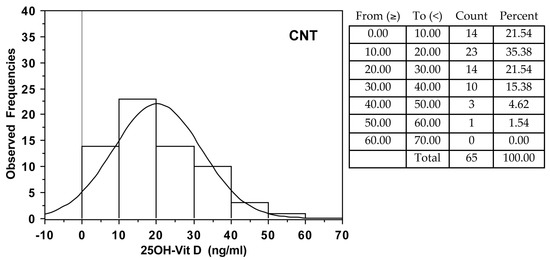 Observed frequencies of 25OH-vitamin D serum levels in COVID-19 patients and control subjects (CNT).