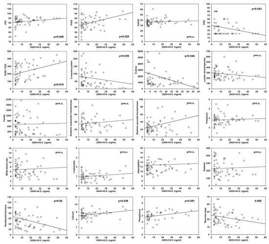 Of note, the multiple regression analysis developed to identify possible effects of blood serum parameters (including 25OHD, C-reactive protein, lymphocytes, D-dimer and ferritin as independent variables) on PaO2/FiO2 ratio (dependent variable) showed vitamin D the only independent variable able to significantly interfere with this clinical parameter (regression coefficient 2.50, t-value 2.05, 95% lower 0.05, 95% upper 4.95, p = 0.046).