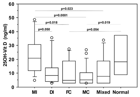 25OH-vitamin D serum levels in COVID-19 patients with different radiological lung involvement. MI = localized/mild interstitial (11 patients), DI = diffuse/severe interstitial (8 patients), FC = focal consolidation (eight patients), MC = multiple consolidations (21 patients), Mixed = mixed abnormalities (13 patients), Normal = absence of radiological involvement (four patients). Data are given as 5th, 10th, 50th (median), 90th, and 95th percentiles. Only statistically significant differences between groups are reported.
