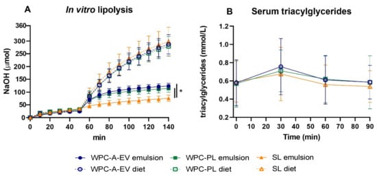 In vitro lipolysis: (A) NaOH titration during simulated human gastric (0–50 min) and intestinal digestion (51–140 min) of whey protein concentrate from acid whey enriched in extracellular vesicles (WPC-A-EV), whey protein concentrate enriched in phospholipids (WPC-PL) or soy lecithin (SL) emulsions (solid line, n = 3) and their corresponding intact diets (dashed line, n = 3). Serum triacylglycerides (TG): (B) Serum TG levels at 0, 30, 60 and 90 min after a 8 mL/kg bolus of the intact WPC-A-EV (n = 20–21), WPC-PL (n = 20–22) or SL (n = 20) diet. Data are presented as mean ± sd. * p < 0.05.