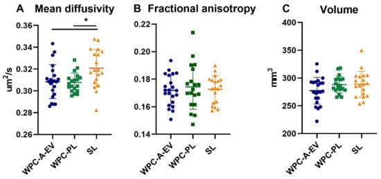 Brain weights and water content on day 19 were similar between WPC-A-EV, WPC-PL and SL groups with an average total brain weight of 35.7 ± 2.2 g across groups (Table S3). DTI analysis showed a lower mean diffusivity in the hippocampus in both the WPC-A-EV and WPC-PL compared to SL group (both comparisons p < 0.05) (Figure 2). However, no differences in mean diffusivity were observed for the remaining brain regions. Nor were there any differences for fractional anisotropy or volumetric measures in any regions (Table S4).