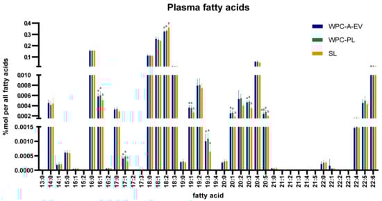 Plasma lipidomics analysis on day 19 afforded the quantitative monitoring of 1017 individual lipid molecules and revealed a similar amount of total lipid levels in all groups (average across groups: 5718 ± 770 pmol/µL plasma). In silico-based total fatty acid analysis showed increased levels of lipid molecules with 16:1, 17:1, 19:1, 19:3, 20:1 and 20:3 fatty acyl chains in the WPC-A-EV and WPC-PL groups, whilst lipids with 18:2 fatty acyl chains were increased in the SL group. Furthermore, the total level of lipids with 20:5 fatty acyl chains were increased in the WPC-PL relative to the SL group (all p < 0.05) (Figure 3). At a molecular lipid species level, higher amounts of sphingomyelin 16:1;2/20:0, 32:1;2 and 38:1;2, lysoalkylphosphatidyl-choline 16:1 as well as ceramide 16:1;2/20:0 and 16:1;2/24:0, and lower levels of the sulfatide 34:2;3 were found in the WPC-A-EV and WPC-PL compared to the SL group. Additionally, the WPC-PL group had higher levels of sphingomyelin 38:1;2 relative to WPC-A-EV (all p < 0.05) (Table S5A). In the hippocampus, 724 individual lipid molecules were measured. There were no differences in the total amount of lipids (average across groups: 4720 ± 1454 pmol/165 µg tissue) or lipid composition of the hippocampus (Table S5B,C).