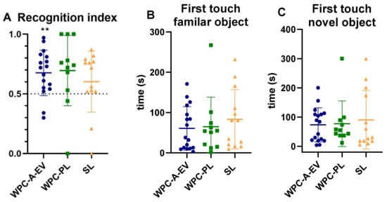Novel object recognition test. (A) Recognition index for the test phase. Latency to first touch of any object in the habituation phase (B) and of the novel object in the test phase (C). WPC-A-EV: whey protein concentrate from acid whey enriched in extracellular vesicles (blue, n = 17), WPC-PL: whey protein concentrate enriched in phospholipids (green, n = 11), soy lecithin: SL (orange, n = 13). Data are presented as mean ± sd. ** p < 0.01 represents the comparison between recognition index and a null preference value of 0.5.