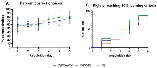 T-maze test: average percent correct choices (A) and percentage of piglets reaching the 80% learning criteria (B) for whey protein concentrate from acid whey enriched in extracellular vesicles (WPC-A-EV, blue, n = 20), whey protein concentrate enriched in phospholipids (WPC-PL, green, n = 16) and soy lecithin (SL, orange, n = 18) groups. Data are presented as mean ± sd.
