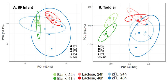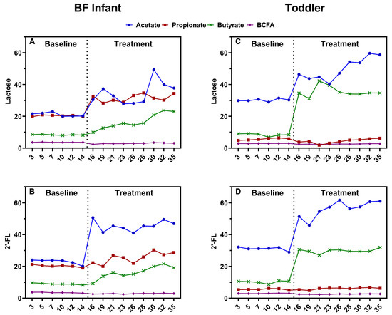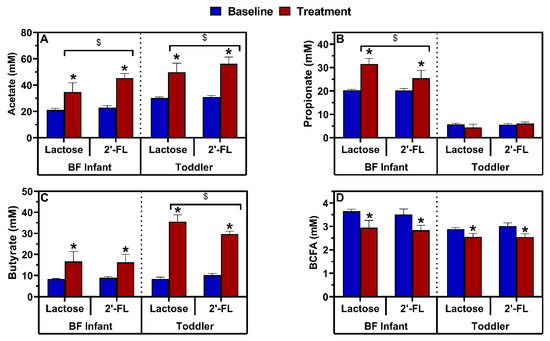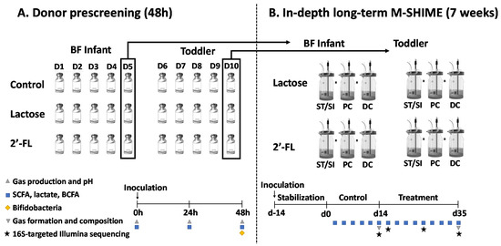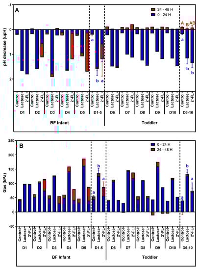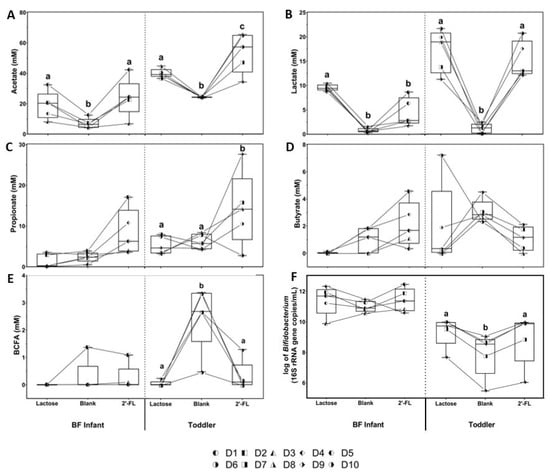 Van den Abbeele, P.; Sprenger, N.; Ghyselinck, J.; Marsaux, B.; Marzorati, M.; Rochat, F. A Comparison of the In Vitro Effects of 2’Fucosyllactose and Lactose on the Composition and Activity of Gut Microbiota from Infants and Toddlers. Nutrients 2021, 13, 726. https://doi.org/10.3390/nu13030726