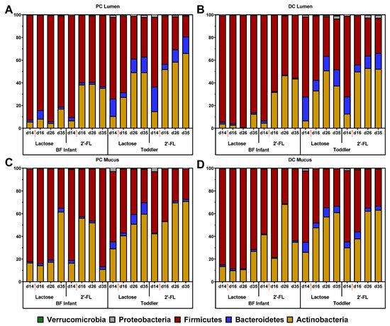 3.2.1. Microbial Composition in the M-SHIME® Model Simulating a BF Infant or Toddler Stool Sample