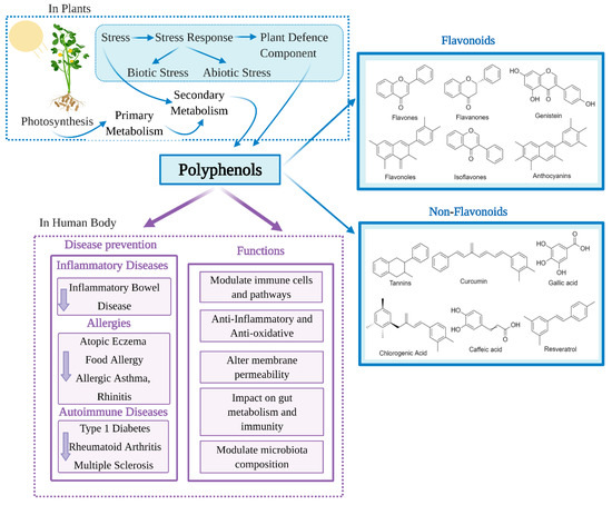 With advancing knowledge of the importance of adequate nutrition, and increased public health awareness about diet, there is growing attention on the health benefits of natural products including those that are rich in polyphenols. Polyphenols are the most extensive group of non-energetic secondary metabolites and are produced by plants in response to stress [1] (Figure 1). Polyphenols have been called ‘lifespan essentials’ due to their significant impact on health [2]. There are as many as 8000 different polyphenols which are divided into different classes based on their chemical structure. Despite the different classifications, all polyphenols have the key structural features of an aromatic ring and at least one hydroxyl group [3,4]. Dietary polyphenols are abundant in plant-based foods such as fruits, vegetables, dry legumes, cereals, olives, cocoa, tea, coffee and wine [5]. Some common dietary polyphenols include the lignins present in nuts and whole-grain cereals; pro-anthocyanidins in grapes, pine bark and cocoa; anthocyanins/anthocyanidins in brightly colored fruits and vegetables like berries; isoflavones in soybeans; catechins in green tea, grapes and wine; tannins in tea and nuts; quercetin in grapes and onion; resveratrol in wines and naringenin/hesperidin in citrus fruits [6].