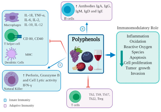 The immune system as a whole consists of innate and adaptive immunity, each with different roles and functions [16]. The innate immune system is the first line of defense, and protects against foreign antigens through the skin, pulmonary system, and gut epithelial cells, forming a barrier between the organism and its environment [17]. The innate system is broadly divided into cellular and non-cellular systems. The cellular system consists of several cell subsets, including dendritic cells (DCs), monocytes, macrophages, granulocytes and natural killer (NK) cells. The non-cellular system is very diverse, ranging from simple mucus barriers to complex protein pathways, such as the complement cascade, however all function to prevent pathogen entry, and facilitate pathogen destruction by phagocytosis [18]. The adaptive immune system comprises T and B cells. B cells secrete antibodies, whilst T cells are involved in the production of cytokines, direct cytotoxic destruction of infected or malignant tissue, and activation of other immune cells [16]. Polyphenols modulate immune responses in both the innate and adaptive systems, having both stimulatory and inhibitory effects in different areas [19] (Figure 2).