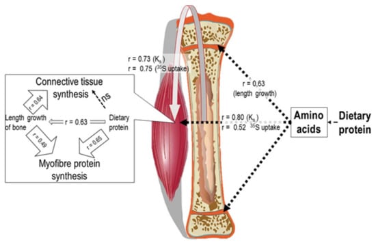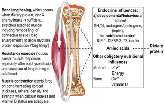 The control of the growth of the major appendicular muscles in childhood is directly related to the lengthening of the associated bone which occurs by endochondral ossification in the growth plate. This latter process is regulated through endocrine and nutritional influences, especially that of dietary protein and by a paracrine/autocrine system of bone growth factors [,] within which amino acids and zinc have direct roles in signal transduction [,,,,], although the specific sites of action in the growth plate have yet to be described. Bone lengthening stretches muscle, activating mechanosensitive pathways [,] at the cell–matrix interface [,] which results in activation of satellite cells to add myonuclei to myofibres which increase protein synthetic capacity in terms of ribosomal RNA [] enabling increased myofibre protein synthesis [,]. In addition, fibroblasts are activated to increase collagen synthesis [,,] which enables remodelling of the ECM, changes observed during the stretch induced growth of a wing muscle in the fowl many years ago []. Bone osteocytes are mechanosensitive and their mineralisation is responsive to mechanical forces exerted by muscle []. Thus, muscle and bone growth are intimately connected in a bidirectional relationship in which bone length growth regulates muscle mass and muscle growth regulates bone strength.