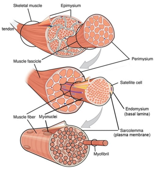 Muscle’s function requires a structure which allows force transduction to be transmitted to its bone levers and as a result its myofibres insert directly onto bone or indirectly via aponeuroses and tendons []. These junctions include connection to the extracellular matrix (ECM) of connective tissue which encases each myofibre, (the endomysium or basal lamina), the fascicles (bundles of myofibres encased in the perimysium), and the entire muscle (epimysium), (see Figure 3), structures which define myofibre and muscle volume and carry the majority of muscle passive load [].