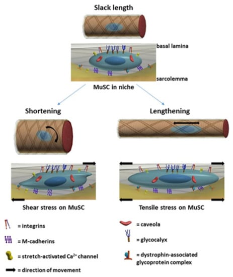 Potential effects of different types of stress on satellite cells. In response to mechanical overload by exercise or stretching, SCs are activated and proliferate to fuse with the host myofibre as shown in Figure 5. Both shear stress through shortening and tensile stress through lengthening may influence satellite cell orientation and deformation. In the unstrained (slack) myofibre is surrounded by a collagen fibre reinforced matrix (top). Below is shown an enlarged lateral view of the SC in its niche between the sarcolemma (yellow) and the basal lamina (BL). Transmembrane proteins anchoring the SC to the sarcolemma include M-cadherins and the dystrophin-associated glycoprotein complex. Both integrins and the glycocalyx anchor it to the BL. Caveolae are invaginations of the plasma membrane which function as message centres for regulating signal transduction and are identified by caveolin-1 which functionally regulates the activation state of caveolae-associated molecules, and which is associated with satellite cells in a more quiescent state []. With myofibre shortening, the sarcolemma will move relative to the BL and this is likely to twist the SC from a longitudinal orientation towards a more radial orientation (direction of arrow). As the myofibre is shortening, the sarcolemma and BL are likely moving at varying speeds, the relative movement of the sheaths will impose a shear force onto the SC, with subsequent cellular deformation. Myofibre lengthening will stretch both the sarcolemma and the BL (direction of arrow), which may induce a tensile stress on the SC. These physical cues, some acting through focal adhesion complexes, are thought to mediate the activation and differentiation of SC. Copied from Boers et al., 2018 [] under the terms of the Creative Commons Attribution 4.0.