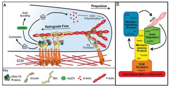 An “outside in” model of mechanotransduction of satellite cells is also supported by the integrin, talin, vinculin focal adhesion as shown in Figure 7B [] which could mediate signalling from the ECM induced by stretch or shear forces as shown in Figure 6, enabling a linkage to the nucleus via the actin cytoskeleton. This links to proteins within the nuclear envelope such as lamins which transmit forces into the nuclear interior, enabling regulation of gene expression by a number of mechanisms [], (see Figure 8; Figure 9).