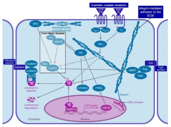 Another important signalling mechanism is the highly conserved hippo pathway [,,,,,]. This is a key regulator of organ size and tissue homeostasis, connecting a number of primary signals including those acting through the actin cytoskeleton with regulation of nuclear transcription via two effectors: Yes-associated protein (YAP) and transcriptional co-activator with PDZ binding motif (TAZ). As transcriptional co-activators, YAP/TAZ cannot bind DNA directly, but interact with DNA-binding transcription factors, e.g., the TEAD family of transcription factors, to regulate target gene expression. The main features of the pathway are shown in Figure 8. Studies in mice indicate that TAZ and YAP have overlapping functions in promoting SC proliferation but TAZ then switches to enhance myogenic differentiation [,]. YAP signalling has been suggested to mediate integrin signalling in the myofibre during skeletal muscle hypertrophy in response to a mechanical stimulus []. These authors suggest a two-step process within the myofibre following mechanical loading in which mTORC1 is activated by amino acid uptake or release from the lysosome to rapidly increase protein synthesis to establish homeostasis, followed by sustained maintenance and remodelling of muscle structure via an integrin–ILK–mTORC2–YAP-driven mechanism.