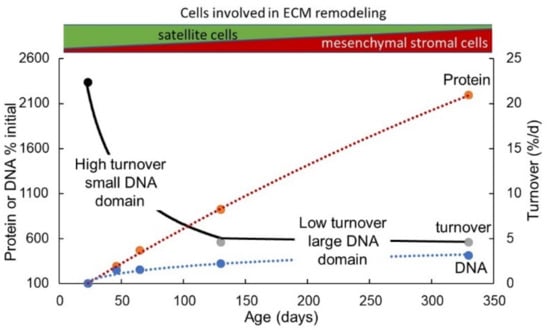 A recent analysis of the cell types and their transcriptomes in adult mouse skeletal muscle [] indicates that in addition to the multinucleated myofibre, 10 additional mononucleated cell types are present comprising immune cells, endothelial cells, glial cells, connective tissue cells, and satellite cells (SCs). Of these SCs are the unipotent muscle stem cells, most obviously the source of new myonuclei in the growing muscle fibres. However, these other cells, often called mesenchymal stromal cells, include other populations of potentially myogenic cells which are molecularly and anatomically distinct from satellite cells, [,], which include pericytes associated with blood vessels [,], and several types of interstitial cells including PW1+/Pax7– interstitial cells (PICs) [] and cells expressing the Twist2 (Tw2) transcription factor []. Other pluripotent progenitor cells lacking myogenic potential are fibro-adipogenic progenitors (FAPs) [] which are important in the maintenance and growth of the extracellular matrix (see below). Whilst the precise role of some of these cells in postnatal human muscle growth is less understood compared with SCs, it is clear that the postnatal muscle is well equipped with a support group for its stem cell-mediated growth [,] in terms of forming new myofibres, associated connective tissue, tendons, blood vessels and nerves. It will be assumed here that during postnatal maturational skeletal muscle growth, satellite cells do play the principal role of mediating myonuclear accretion within the myofibre to support the additional transcriptional demands of protein synthesis associated with postnatal development and protein turnover in the growing muscle myofibre. Certainly in the mouse there are significant increases in mouse myofibre size and myonuclear number between prepuberty and early adolescence/puberty onset (4–6 weeks of age) and experimental prepubertal depletion of SCs reduced myofibre size and myonuclear number, and caused force generation deficits) []. However, as discussed below, there seems to be a phase of myofibre enlargement during the post pubertal growth phase in the adult rat with fewer additional myonuclei added so that the connective tissue remodelling needed for “bag enlargement” at this time must be achieved by achieved by the mesenchymal stromal cells which support SCs.