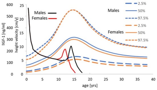 It is generally accepted that GH and IGF-1 are the main primary drivers of length growth [,,] but in the foetus and early infancy, GH may be much less involved, with IGF-1 and insulin playing the major role. In the Karlberg infancy–childhood–puberty (ICP) growth model of three additive and partly superimposed components of linear growth, this infancy component is proposed to last for about 10 months [,,].