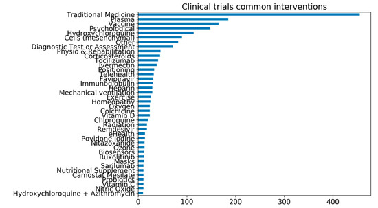 In over 6,417 clinical trials registered worldwide, vitamin D, colchicine, vitamin C, probiotics, and nutritional supplements are among some of the main interventions under investigation. Surprisingly, traditional medicines are the most common shared intervention in registered clinical trials globally (Figure 1) [14,44]. Several of the trials investigating Chinese traditional medicine have been reviewed elsewhere [45].
