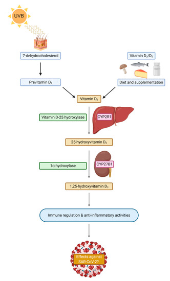 A simplistic schematic of vitamin D sources and synthesis in humans. CYP2R1 = Cryptochrome P450 familiy 2 subfamily R member 1; CYP27B1 = Crytochrom P450 family 27 subfamily B member 1; SARS-CoV-2 = Severe acute respiratory syndrome coronavirus 2.