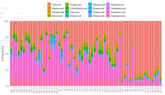 Compared to AP patients, HC displayed a significantly higher percentage of acetic, propionic, butyric, valeric, heptanoic, and nonanoic acids and a significant reduction of butyric, 2-methylbutyric, isovaleric, hexanoic, tetradecanoic, hexadecanoic, and octadecanoic acid abundances.