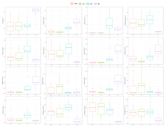 Boxplots representing each FFA percentage in CD, CRC, AP patients and HC.