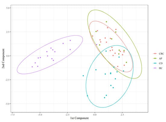Recently, using the same GC–MS system, we analyzed the fecal SCFA profile of the same patients and found a definite overlap between HC and CD patients, while CRC and AP patients displayed a divergence from the other two classes and did not completely coincide [22].