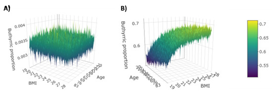 The magnitude of these interactions is moderate, and it should be interpreted as “deviation” from the CD–butyric acid effect. That means, e.g., that on average among patients with the same age and same gender, every additional BMI point is associated with a 0.1161 increase of the CD effect on the (log) prevalence of butyric acid in FFA composition. Further interesting information given by the interaction is that on average among patients with the same age and same BMI, being male compared to being female implies a 0.2278 decrease of the effect of CD on the (log) prevalence of butyric acid in FFA composition. The 3D plots in Figure 4 illustrate the prevalence of butyric acid as a function of age and BMI in a female subject affected or not affected by CD.