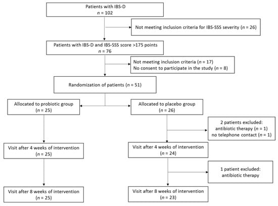 During screening visits, the patients underwent physical examination to establish the presence of clinical inclusion criteria. Out of 102 patients with IBS, 76 met the inclusion criteria for IBS severity (IBS-SSS score > 175), with 17 of them not meeting some of the other inclusion criteria and a further 8 not agreeing to participate in the study (Figure 1). In consequence, 51 patients meeting all inclusion criteria signed the informed consent form. All the participants were instructed on how to assess the symptoms for which they would be asked by telephone interviewers and were trained not to consume foods and dietary supplements containing probiotics. During the first baseline visit, patients after evaluation with the use of a IBS-SSS scale were allocated to either the probiotic or placebo group according to a computer-generated randomization list. The block randomization method was used to ensure a balance in sample size across groups over time []. Each block had a size of 2n, where n was the number of patients supplemented with probiotic or placebo (in our study, patients were supplemented with either product C or D). The randomization list was generated assuming that the number n = 2, and possible treatment allocations within each block were CCDD, DDCC, CDCD, DCDC, CDDC, and DCCD. The block size was not disclosed to the investigators, and the allocation was blinded to both patients and investigators. Patients were asked to take orally one capsule of the probiotic preparation or placebo 2 times a day over an 8-week period. Patients reported to a physician every 4 weeks in order to receive the probiotic preparation or placebo for the next 4 weeks and to be clinically assessed.