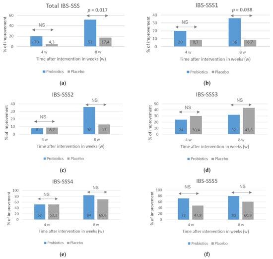 The percentage of patients with an improvement in IBS symptoms evaluated with the use of the IBS-SSS after probiotic treatment lasting 4 and 8 weeks. The total IBS-SSS score (a) and domain-specific scores related to the severity of pain (b), frequency of pain (c), dissatisfaction with bowel habit (d), severity of flatulence (e), and quality of life were analyzed (f). An improvement was defined as at least a 30% decrease in scores compared with baseline scores. NS = no significance (p > 0.05). Statistical analysis performed with the use of Fisher’s exact test.