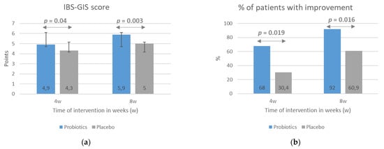 The results indicating a beneficial impact of the probiotic intervention on IBS symptom severity evaluated with the IBS-SSS scale with respect to baseline scores were confirmed with the use of the IBS-GIS. Patients from the probiotic group rated the improvement in symptom severity as significantly greater than placebo-group patients, both after 4 weeks (p = 0.04) and 8 weeks (p = 0.003) of intervention (Figure 3a). According to the study design, an improvement in symptoms was a rating of >4 points on the IBS-GIS, a rating of 4 meant a lack of improvement, and a rating of <4 indicated a worsening. Consequently, the percentage of patients rating the improvement in their symptoms at >4 points was significantly higher in the probiotic group compared with the placebo group at both treatment time points (Figure 3b).