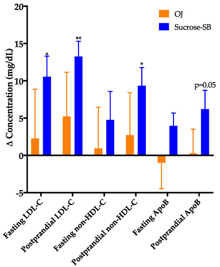 Changes of fasting and late-night postprandial low-density lipoprotein cholesterol (LDL-C), non-high-density lipoprotein cholesterol (non-HDL-C) and apolipoprotein B (ApoB) in women consuming either naturally-sweetened OJ (orange bars) or sucrose-SB (blue bars) for two weeks. * p < 0.05, ** p < 0.01, LS mean of change different from zero, primary ANCOVA.
