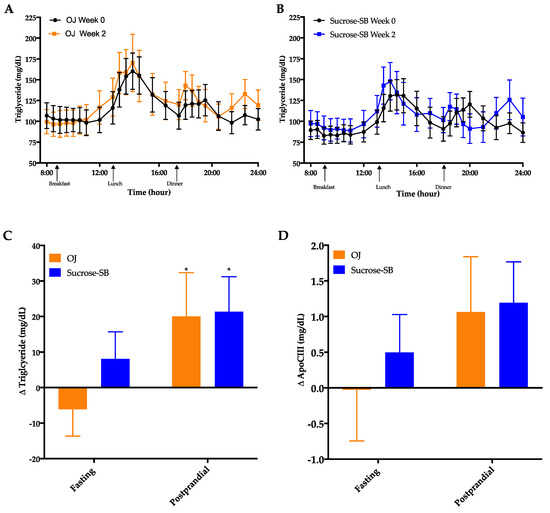 Sixteen-hour circulating triglyceride (TG) concentrations before (black line) and after (blue line) consumption of either (A) OJ or (B) sucrose-SB for two weeks. Changes in fasting and postprandial (C) triglyceride and (D) ApoCIII after two weeks of OJ or sucrose-SB consumption. * p < 0.05, LS mean of change different from zero. Apolipoprotein CIII (ApoCIII).
