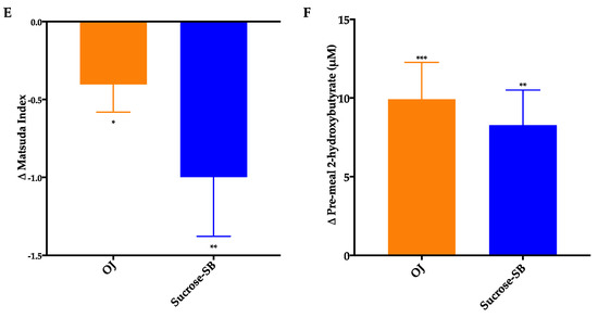 Metrics of insulin sensitivity measured by oral glucose tolerance test (OGTT) and the metabolite, 2-hydroxybutyrate. Glucose curves during the OGTT before (black line) and after (blue line) consumption of either (A) OJ or (B) sucrose-SB for two weeks; Insulin curves during the OGTT before (black line) and after (blue line) consumption of either (C) OJ or (D) sucrose-SB for two weeks; (E) Changes in Matsuda Index; (F) 2-hydroxybutyrate concentrations measured after a 4-h fast. * p < 0.05, ** p < 0.01, *** p < 0.001 LS mean of change different from zero.