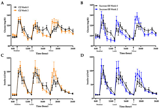 The 16-hour circulating glucose and insulin concentrations before (black line) and after (blue line) consumption of either (A,C) OJ or (B,D) sucrose-SB beverage for two weeks. Plasma was collected during consumption of energy-balanced meals at breakfast, lunch and dinner containing 55% Ereq as complex carbohydrate at baseline and during consumption of energy-balanced baseline diets containing 30% Ereq as complex carbohydrate and 25% as OJ or sucrose-SB at 2 weeks.